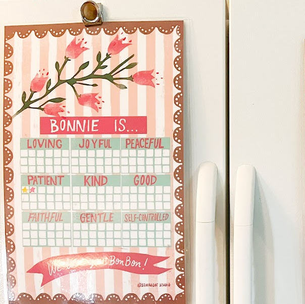 Laminated positive behavior chart that goes on the fridge to reward the child and work towards a goal! Please include the name for the top and nickname (if applicable) for the bottom banner. 11x17